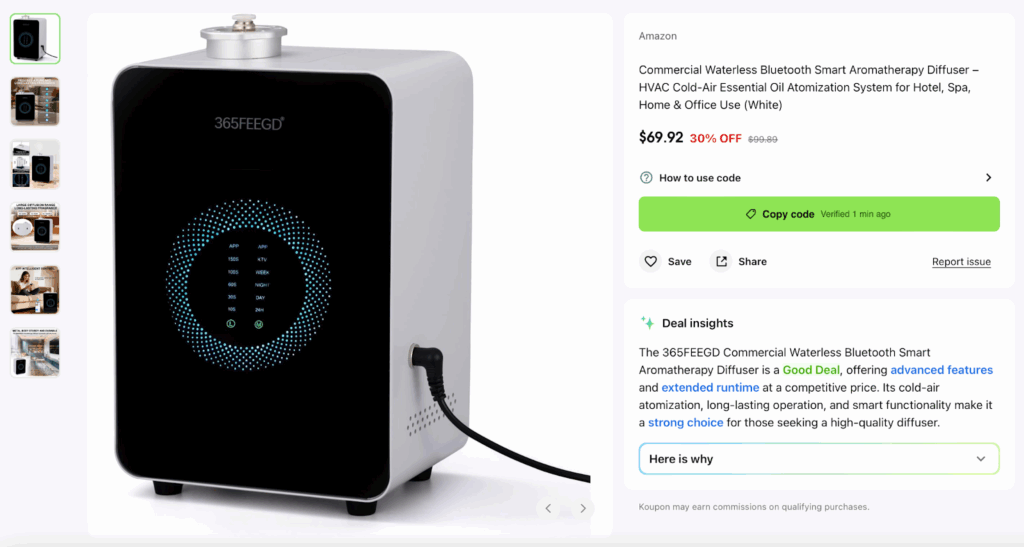 - Commercial Bluetooth Smart Aromatherapy Diffuser – $99.89 → $69.92 (30% OFF)