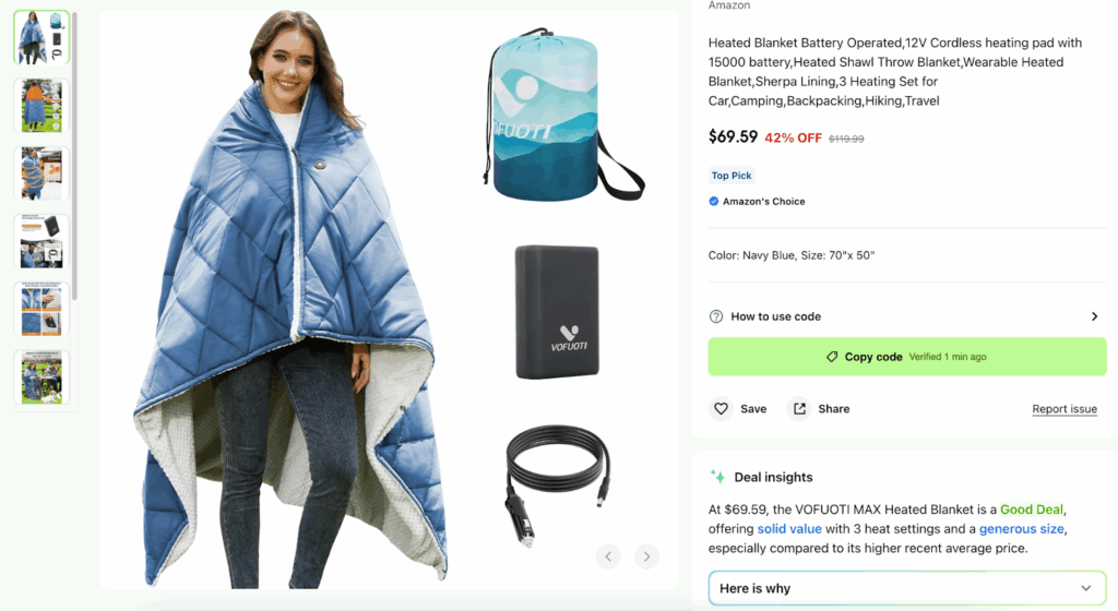 - Heated Blanket Poncho – $119.99 → $69.59 (42% OFF):