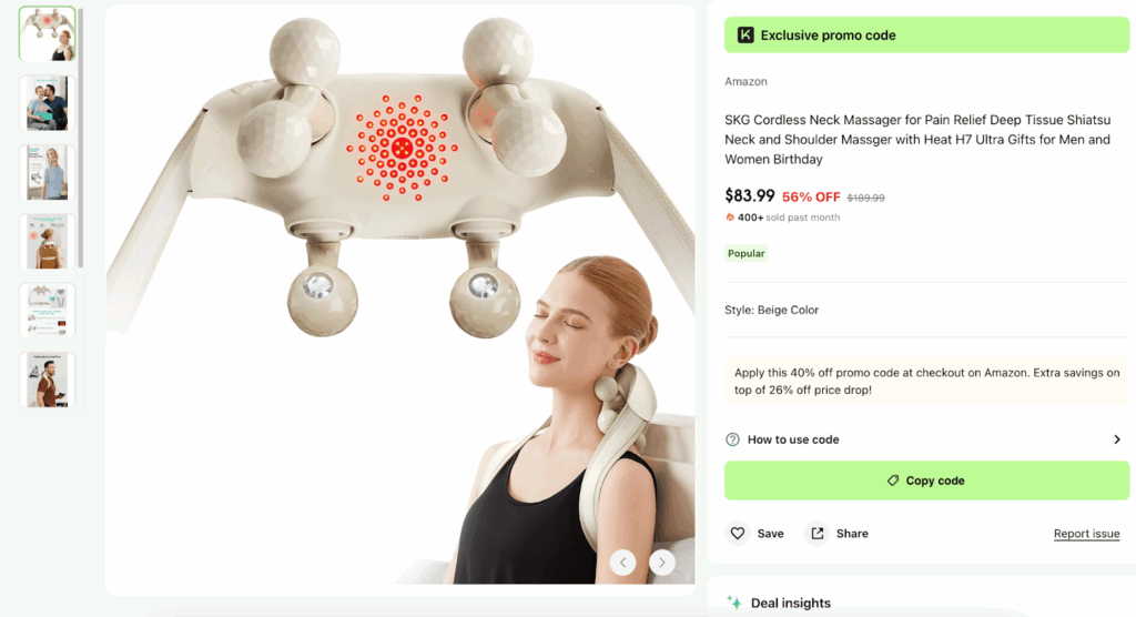 - SKG Cordless Neck & Shoulder Massager with Heat – $189.99 → $83.99 (56% OFF, Koupon Exclusive):