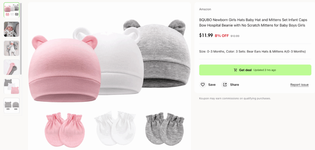 - QUBO Newborn Hat & Mittens Set (3 Sets) – $12.99 → $11.99 (8% OFF):