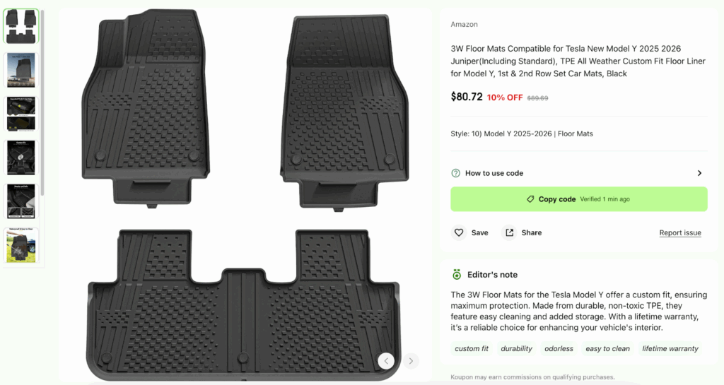 - 3W Floor Mats Compatible for Tesla New Model Y – $89.69 → $80.79 (10% OFF):