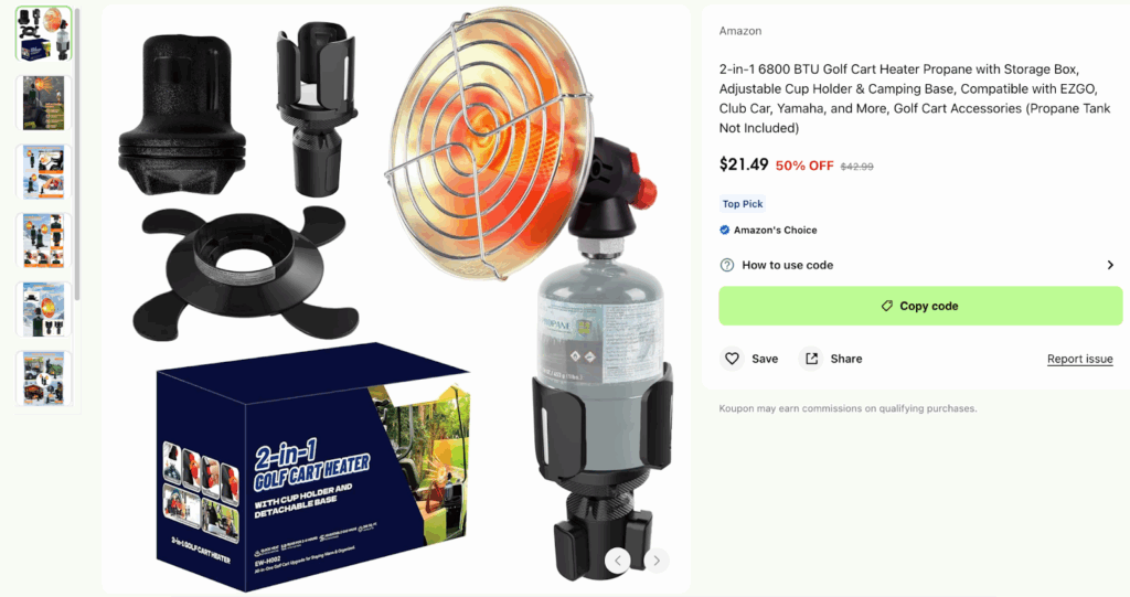 - 2-in-1 6800 BTU Golf Cart Heater Propane with Storage Box – $42.99 → $21.49 (52% OFF)
