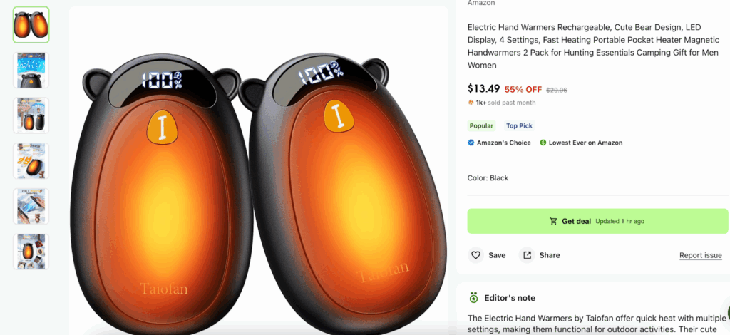 - Rechargeable Hand Warmers (2-Pack) – $29.96 → $13.49 (55% OFF):