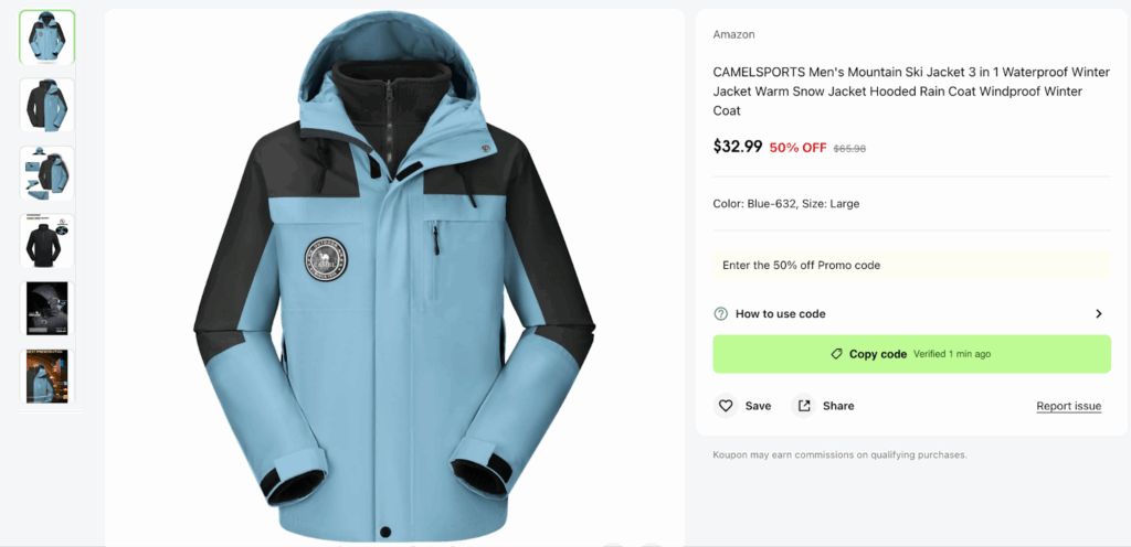 - CAMELSPORTS Men’s 3-in-1 Waterproof Winter Ski Jacket – $65.98 → $32.99 (50% OFF)