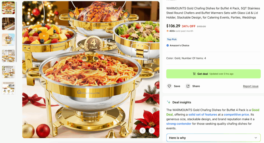 - WARMOUNTS Gold Chafing Dishes (4-Pack, 5QT) – $159.99 → $106.29 (34% OFF):